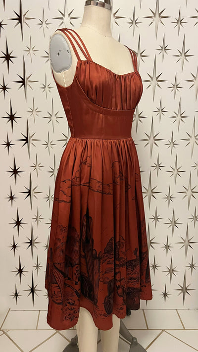 Flaunt your extraordinary style in this one-of-a-kind Custom Pueblo Border Print Dress! It's the perfect blend of swanky bronze color, stretch sateen, and gathered circle skirt. Plus, you'll love the pockets – and the triple strap detail ain't so bad either! Shine bright in this unique stunner!