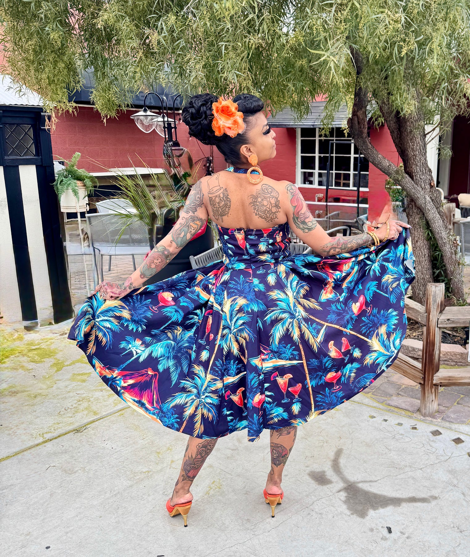 Mit unserem Beachcomber Swing Dress in unserem individuellen Black Hibiscus-Print ziehen Sie in den Tropen alle Blicke auf sich! Dieses süße Retro-Kleid mit individuellem Print, seitlichen Raffungen für eine perfekte Passform und Taschen ist perfekt für einen Tag auf der Insel. Viel Spaß!