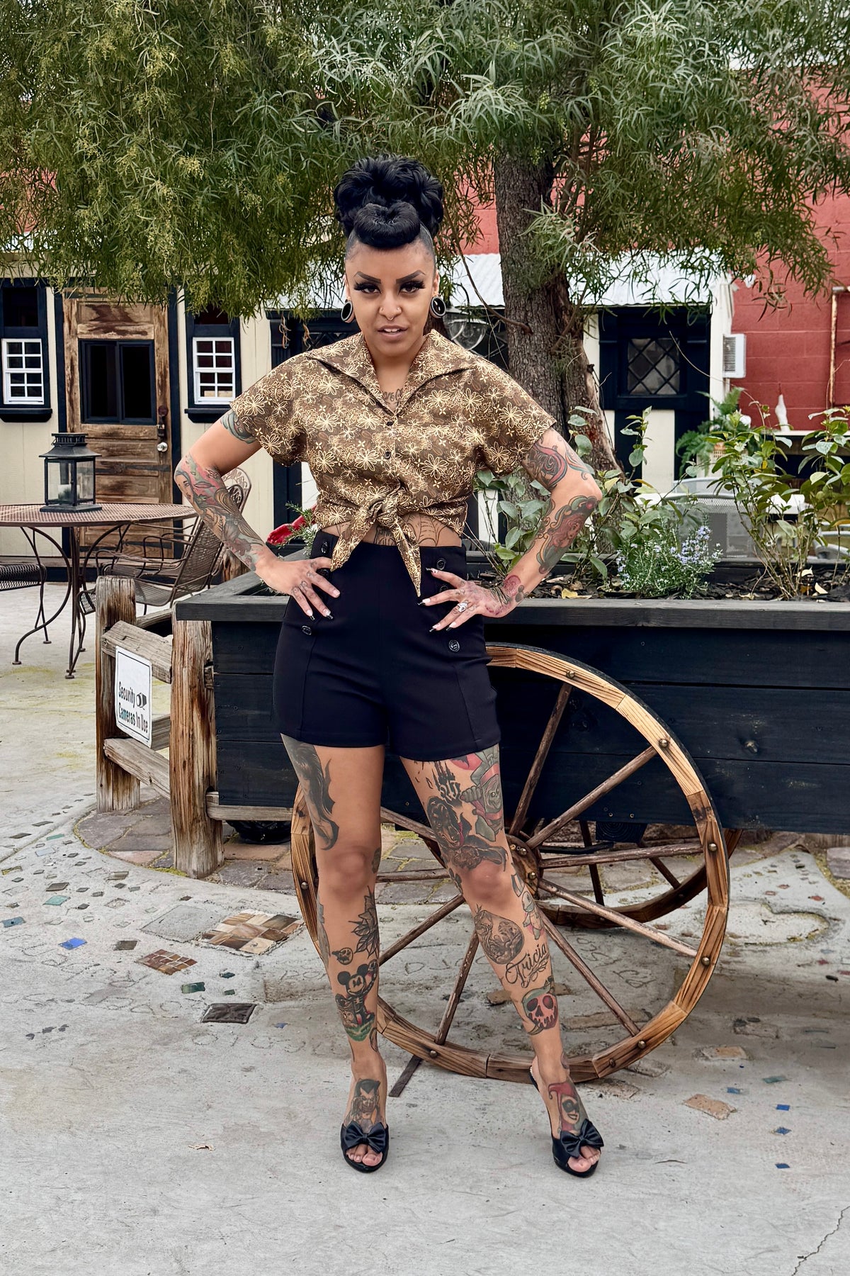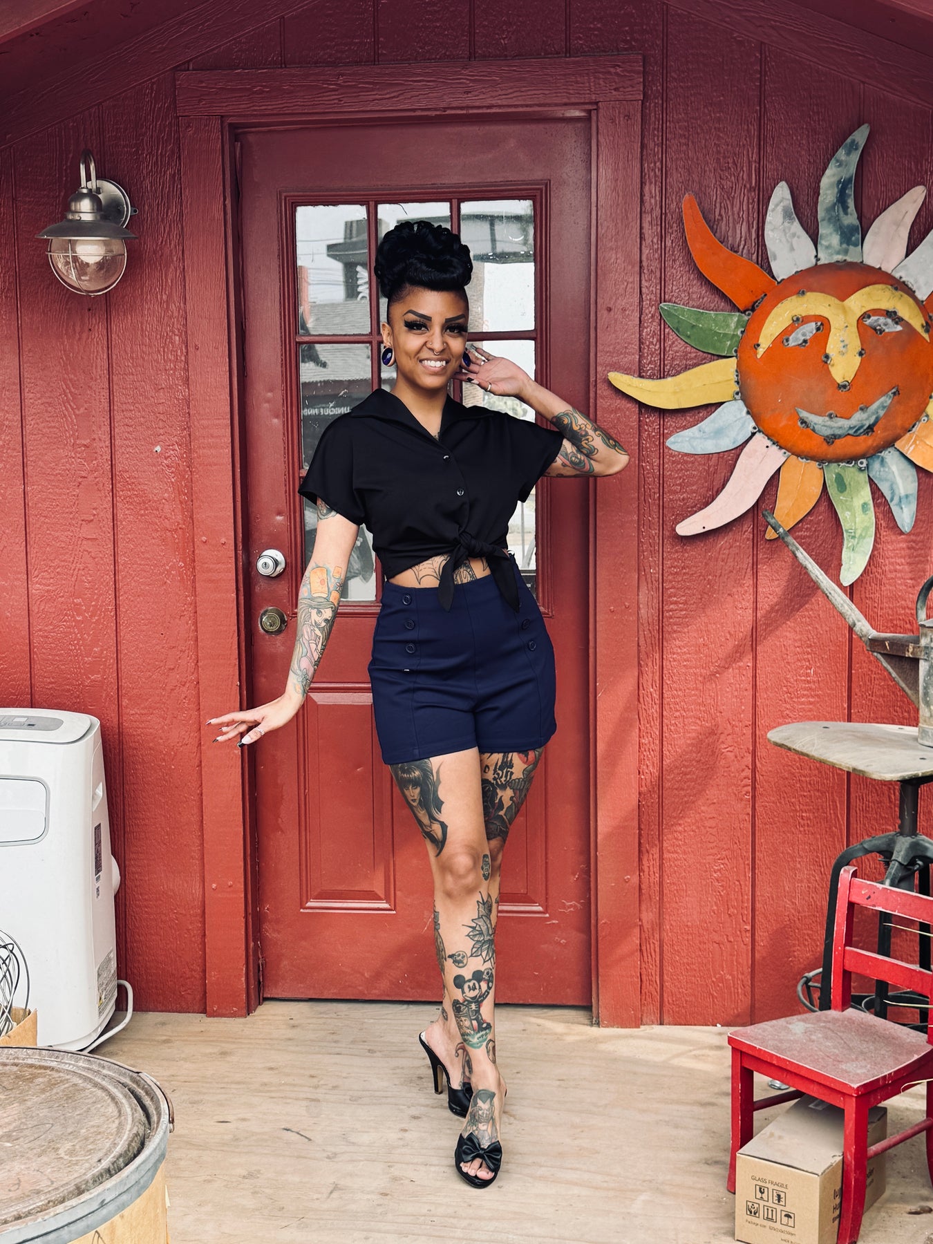 High-waisted shorts with a cheeky pinup vibe and serious comfort. Rock the front sailor-style buttons for that classic retro look, while the hidden back zipper keeps things sleek. Crafted from stretchy fabric that moves with you, these shorts deliver vintage style without sacrificing all-day wearability. Perfect for anyone who wants to turn heads and feel fabulous doing it.