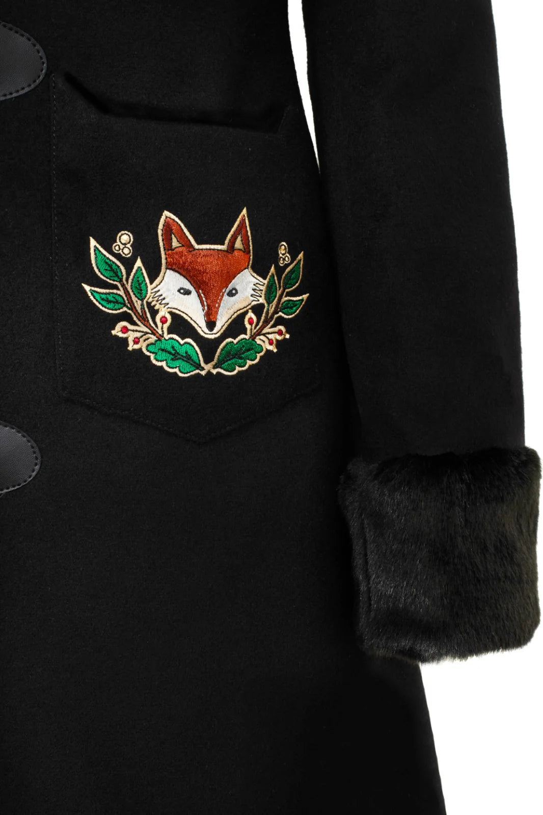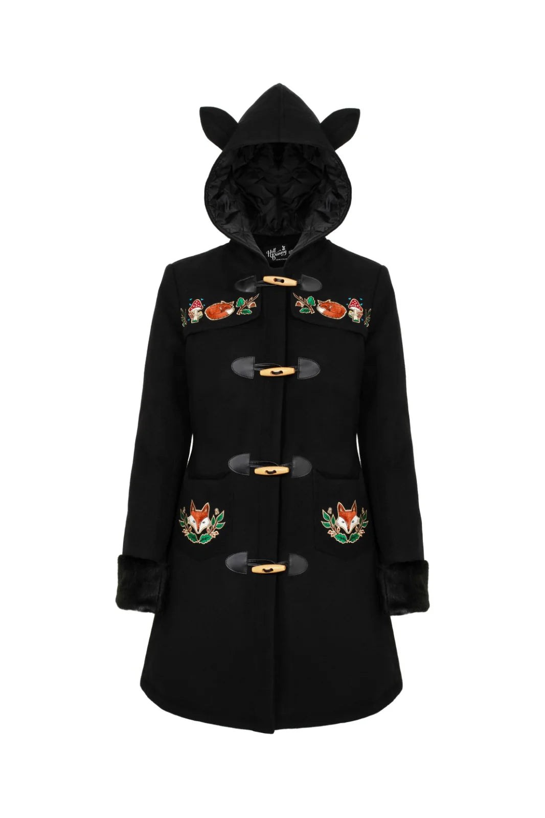 Bleiben Sie warm und stilvoll in unserem Basil Coat. Dieser schwarze Dufflecoat besticht durch ein süßes Ohrendetail an der Kapuze, einen hölzernen Knebelverschluss und eine Stickerei mit einem schlafenden Fuchs auf den Brustklappen und Vordertaschen. Das wattierte Futter und die schwarzen Kunstfellbündchen sorgen für zusätzliche Wärme und machen ihn perfekt für kühle Tage. Der A-Linien-Schnitt schmeichelt jeder Figur. Erhältlich in verschiedenen Größen.