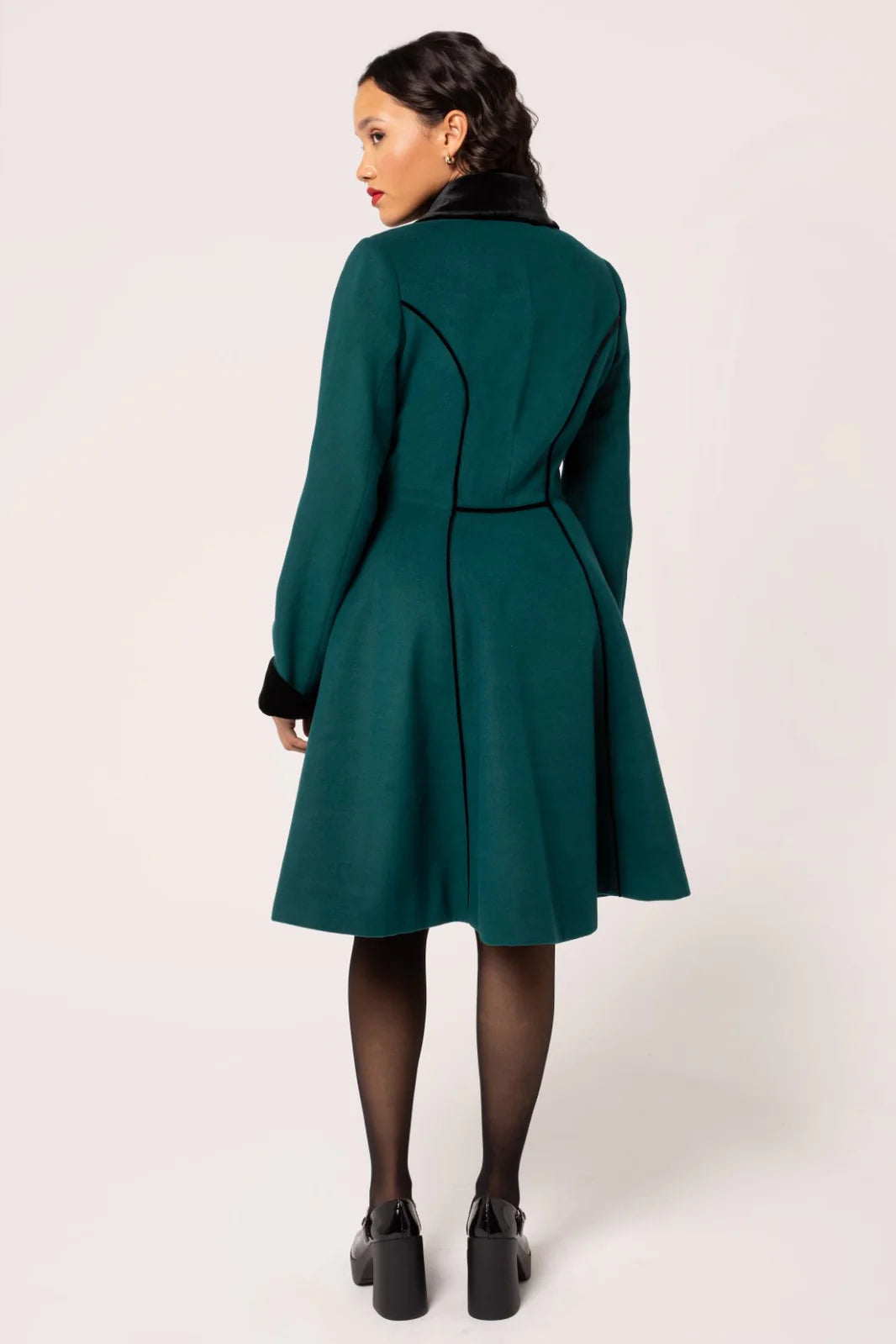 Machen Sie sich bereit, mit dem Harper Coat alle Blicke auf sich zu ziehen! Dieser stylische Mantel in Retro-Grün hebt Sie von der Masse ab. Der geschwungene Kragen und die Manschetten aus schwarzem Samt verleihen ihm einen Hauch von Eleganz, während die Prinzessnähte und das ausgestellte Design für eine perfekte Passform an jeder Figur sorgen. Mit schwarzen Samtpaspeln und bezogenen Knöpfen ist dieser Mantel sowohl funktional als auch modisch. Die Taschen machen ihn zudem alltagstauglich. Werten Sie Ihre Garderobe mit dem Harper Coat auf!