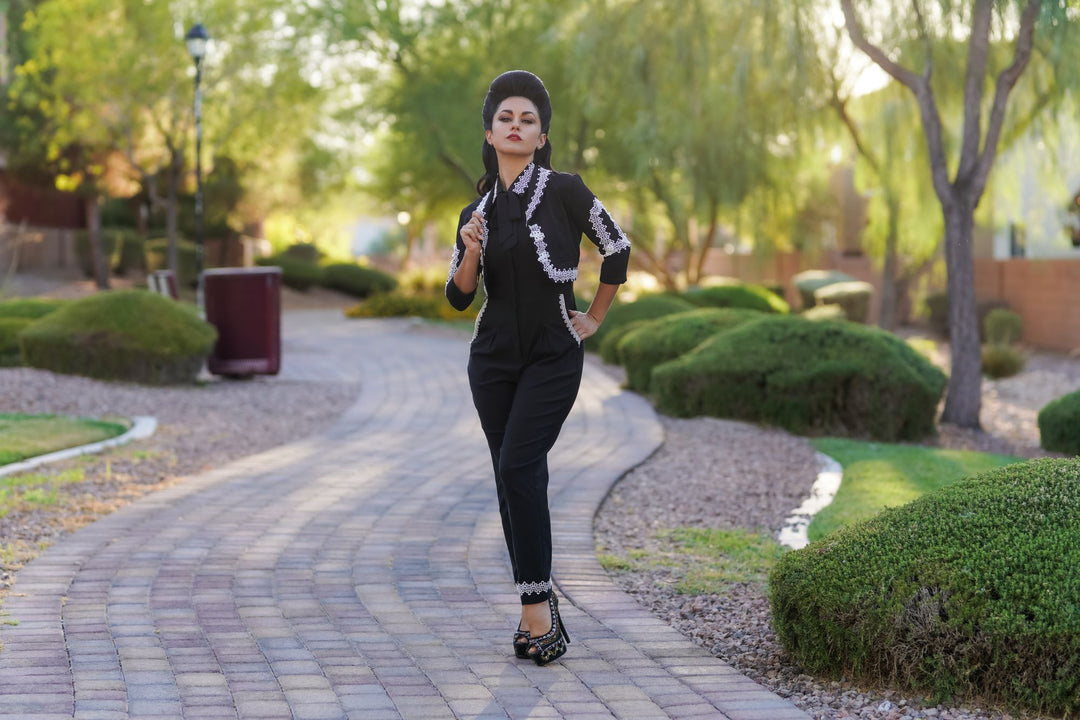 Jumpsuit im Mariachi-Stil aus elastischem Bengaline mit besticktem Spitzenkragen, Gesäßtaschen und Saum. Verdeckter Reißverschluss vorne mit Schärpe am Hals. Mit schmal zulaufendem Bein im 40er-Jahre-Stil mit Abnähern. Der Jumpsuit hat eine verlängerte Schritttiefe und ist sowohl für kleine als auch für große Frauen geeignet.