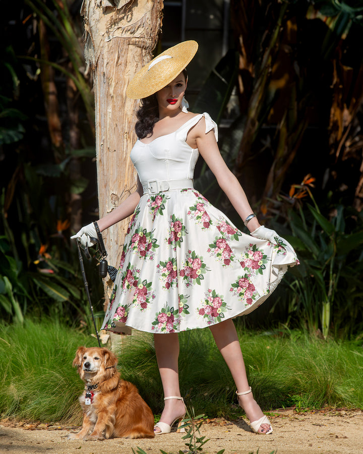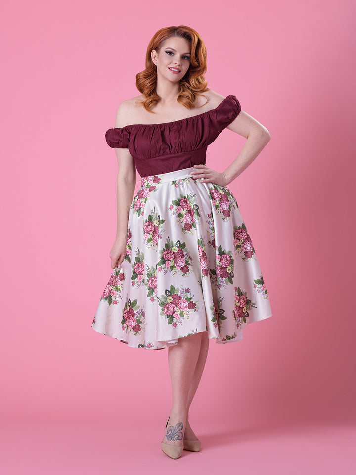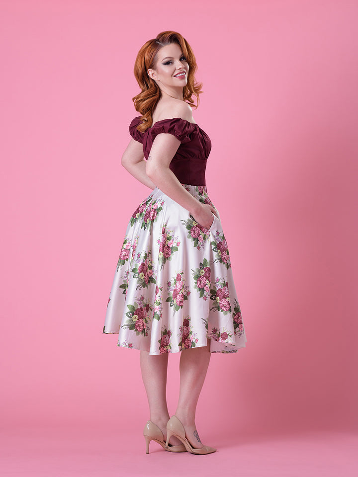 Our Custom Cream floral skirt is an authentic reproduction of a 1950's classic, crafted from luxurious sateen material and boasting gathered sides for a perfect fit and flare. The included petticoat adds an unmistakably vintage look and feel. Get ready to step back in time!
