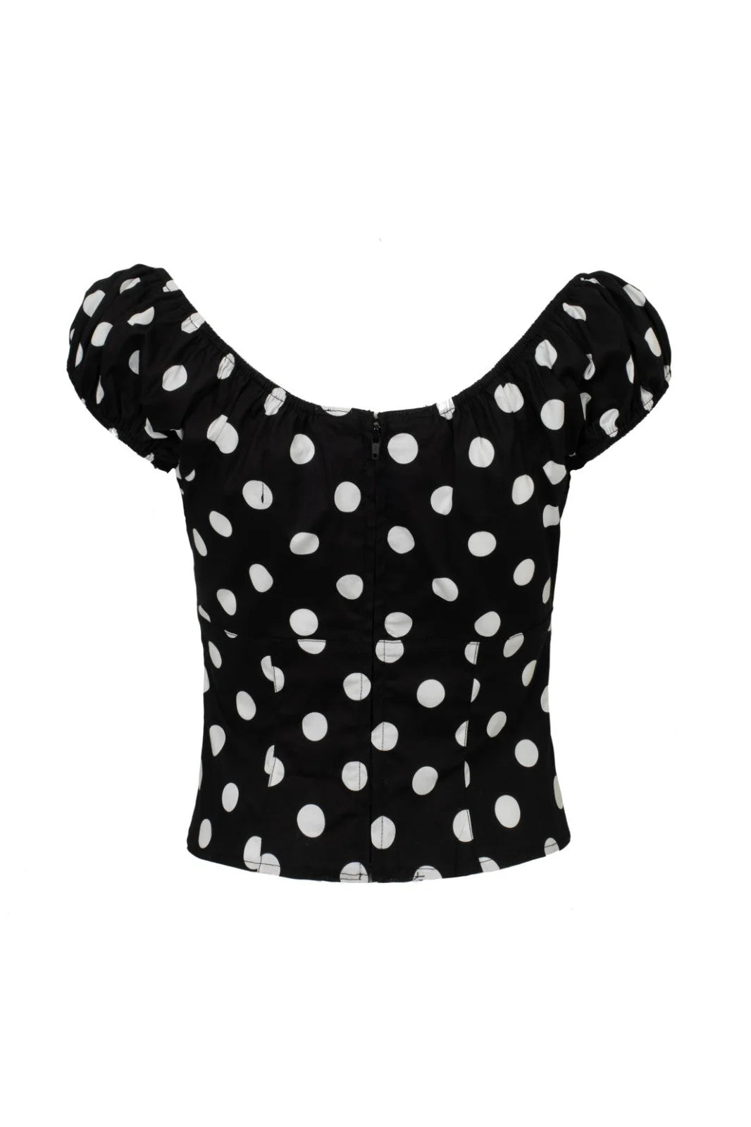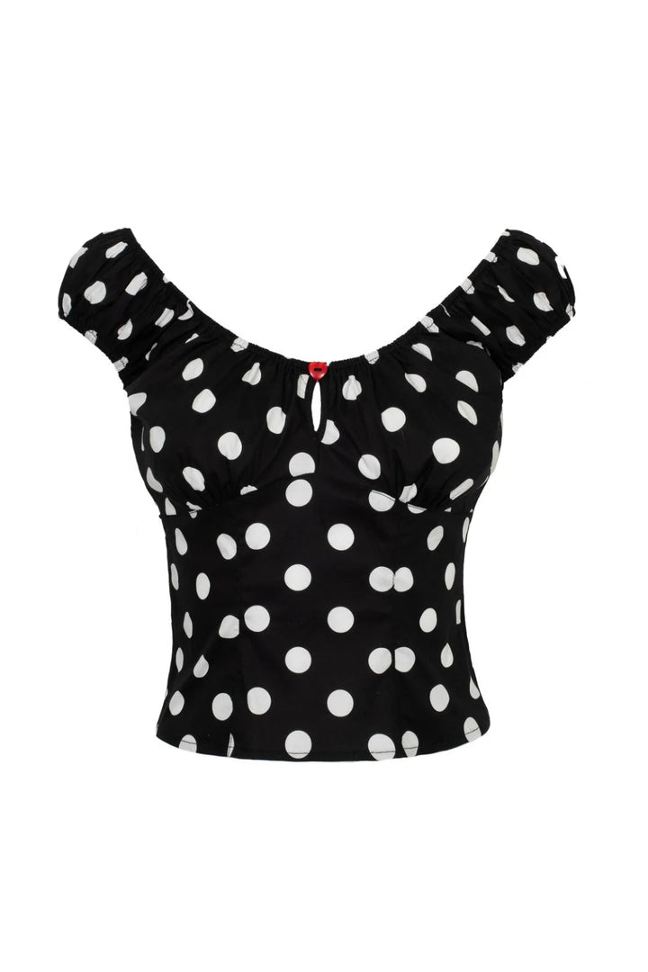 Get a spot of vintage glamour with the Domino Top. This retro style fitted top features elasticated sleeves that can be worn on or off the shoulder, a keyhole front with a flirty red heart button, and an underbust seam for added shape. Made with 98% cotton and 2% elastane, it provides slight stretch for a comfortable fit. Stick to the advised sizing for a perfect fit, or size up if in between sizes. Centre front length is 31.5cm on size small.