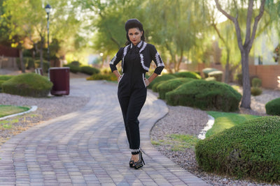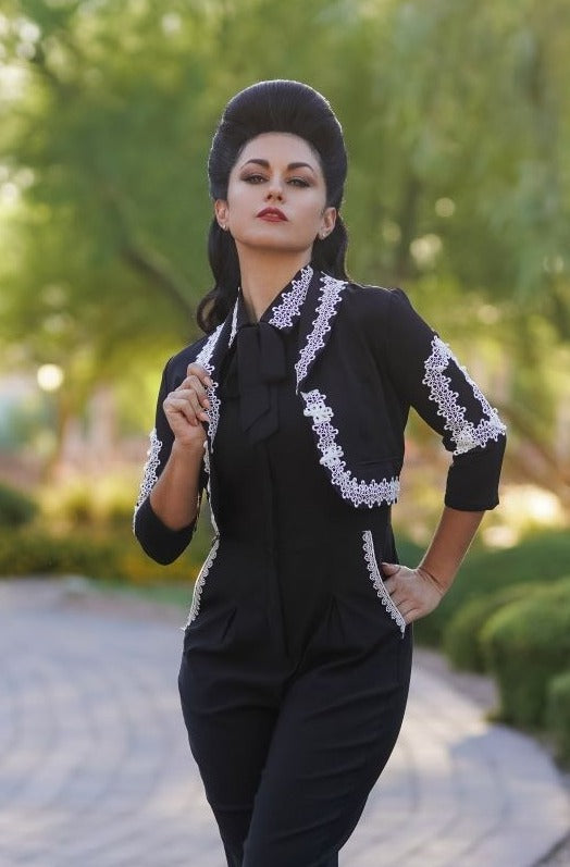 Either pair this amazing Bolero with our La Rambla jumpsuit or with a cute pencil or even jeans this will sure to be one of your favorite items. La Rambla bolero is high waist cut featuring 3/4 sleeves shawl collar and Mariachi style lace trimming.